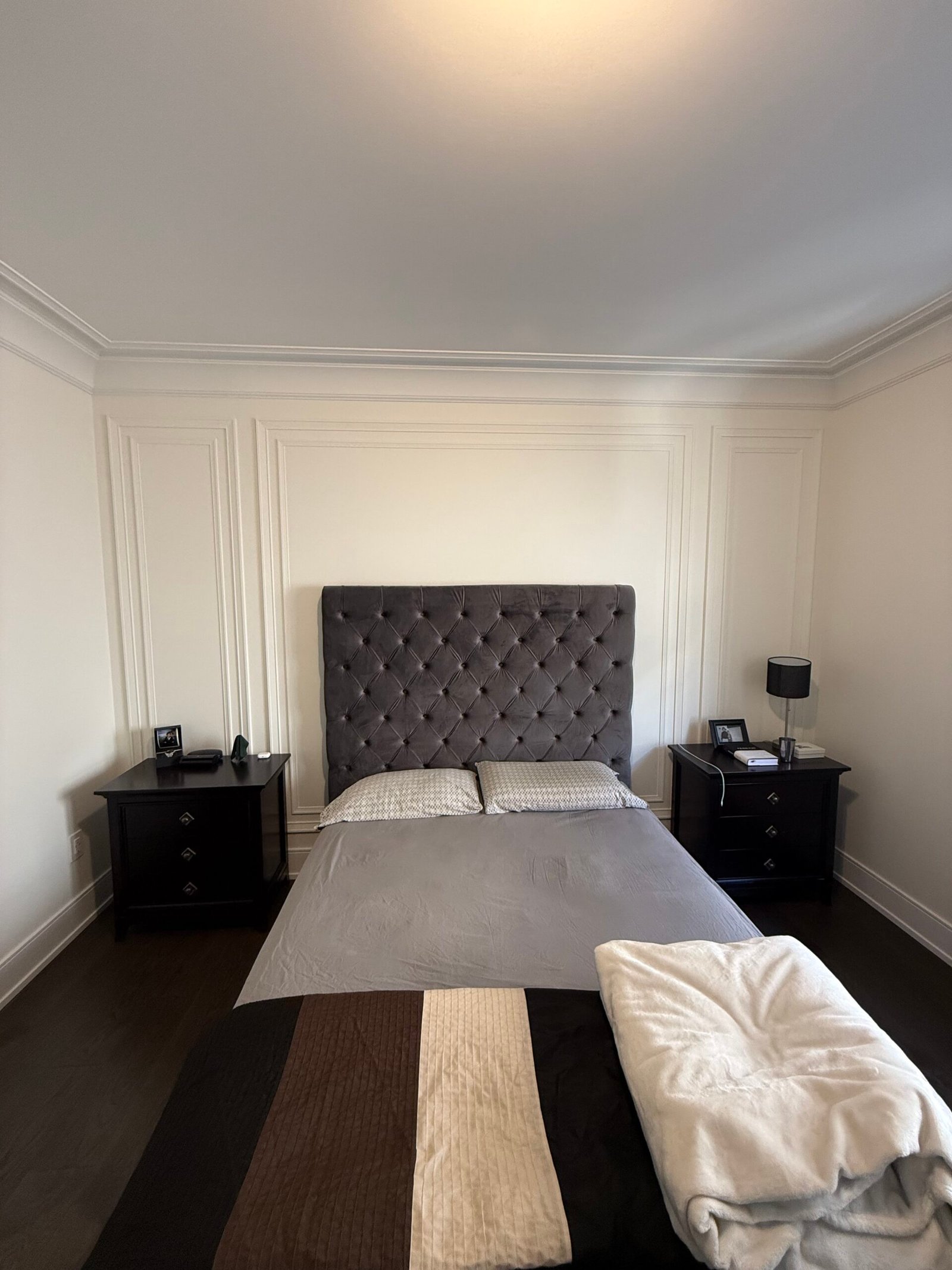 For this project, we installed elegant floor-to-ceiling wainscoting accented with a refined chair rail that separates the two levels of paneling. This sophisticated design flows seamlessly throughout the entire main floor, continues down the basement staircase, and carries along the main staircase leading to the upper level. The master bedroom features a custom statement wall with fluted panels and large MDF double-box wainscoting, creating a perfect balance of modern detail and timeless craftsmanship.